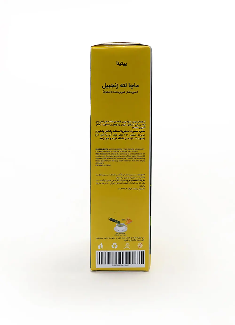 - ترکیبات: پودر ماچا تشریفاتی، پودر زنجبیل، پودر شیر غیرلبنی و استویا (شیرین کننده بدون کالری)